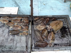 下段の右側が紋甲イカですが1番大きいのが甲羅が30センチありました,(約2キロ)